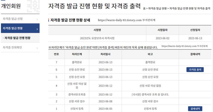 합격 안내를 받으셨다면 국시원 요양보호사 자격시험 홈페이지를 통해서 자격증 발급신청을 진행해주시면 됩니다.